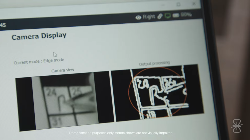 รากเทียมตาขนาดเพียง 2×2 มิลลิเมตร ที่ฝังใต้จอประสาทตาจะรับสัญญาณภาพจาก กล้องบนแว่นอัจฉริยะ ซึ่งจะส่งภาพขยายผ่านแสงอินฟราเรดเข้าสู่รากเทียม จากนั้นรากเทียมจะส่ง “สัญญาณไฟฟ้าเลียนแบบการทำงานของเซลล์ประสาทตา” ไปยังเส้นประสาทตาโดยตรง